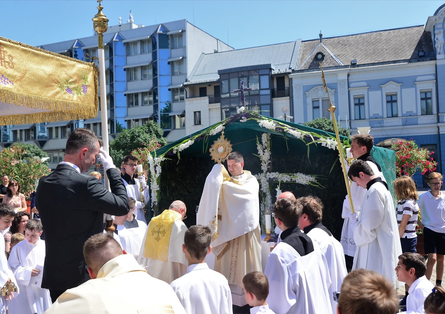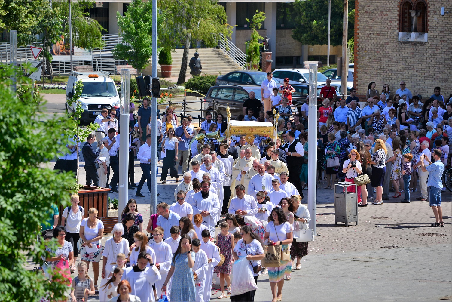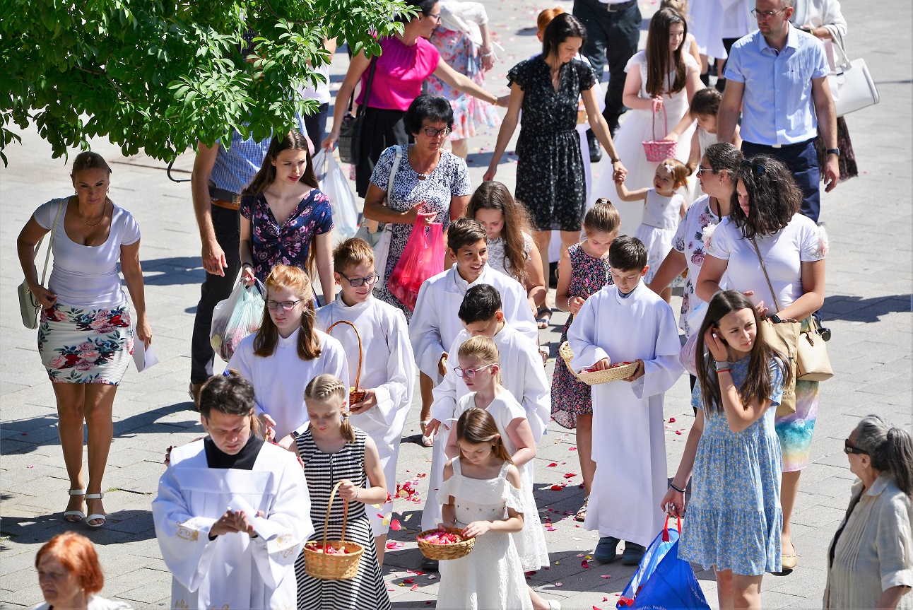 Az ünnepi szentmise a szokásos útvonalon körmenettel, majd szentségi áldással zárult. Külön öröm az idén elsőáldozó gyermekek részvétele az úrnapi körmeneten, akik virágszirmot szórnak az Eucharisztia elé.