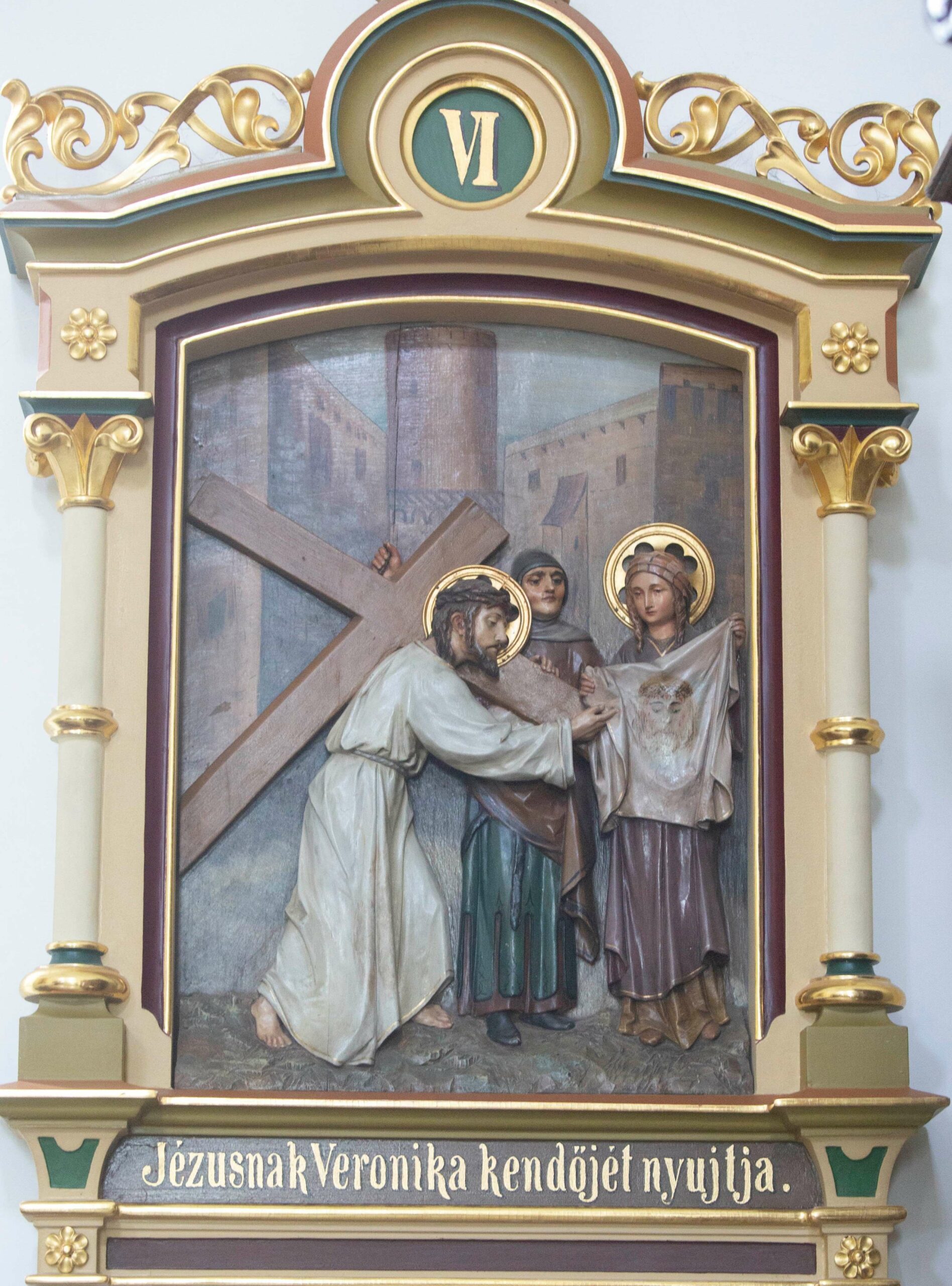 És végre akadt valaki, aki könnyeket töröl, véres verítéket itat kendőjével, könnyítve a szenvedést! – Hazánkban is millió a könnyes szem és néha patakokban folyt a vér… Mind Veronika után kiált! Mert egy Veronika nem győzi! És mindig akadtak Veronikák: Árpádházi Szent Erzsébettől, Szent Margittól, Kanizsai Dorottyán át a névtelen apácák százai, ezrei, akik árvaházakban, kórházakban hősi szeretettel töröltek könnyeket, verítéket a magyar arcokról. Vagy hősi anyáink, akik – míg apáink a hazáért harcoltak – vetettek, arattak a család mindennapi kenyeréért – magyar édesanyák! Neveljetek a hazának lányaitokból új Veronikákat! Mert szükség volt eddig is, most is és ezután is – még inkább! Leleményes szeretetükre, könnyeket elállító mosolyukra, a bűn vérzivataraiban óvó helyükre! Jutalmuk az, ami Veronikáé volt. Ő a kendőjébe, a mai Veronikák a szívükbe rajzolt Krisztus-arc ajándékát kapják és adják tovább az új magyar szívekbe.
