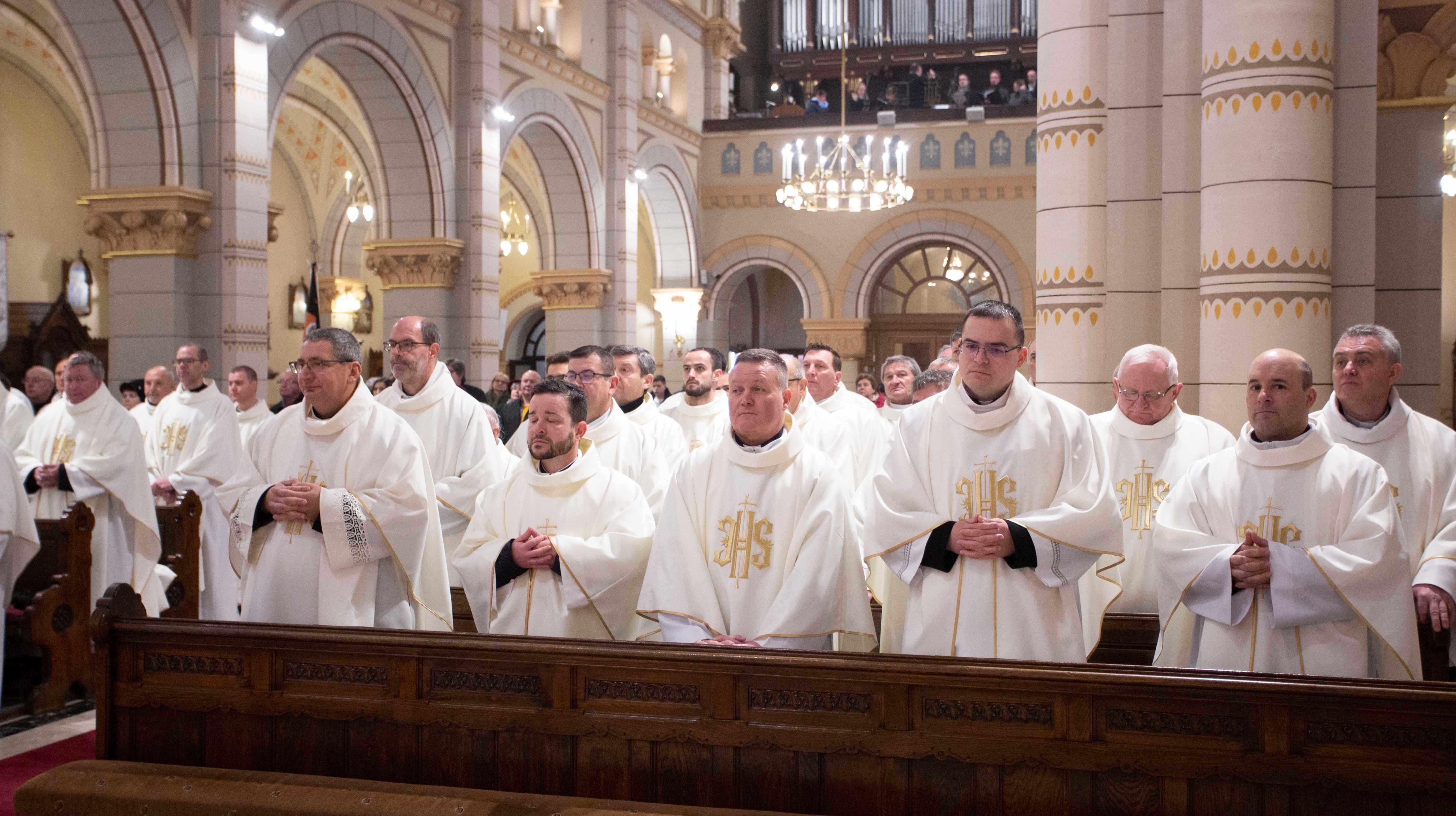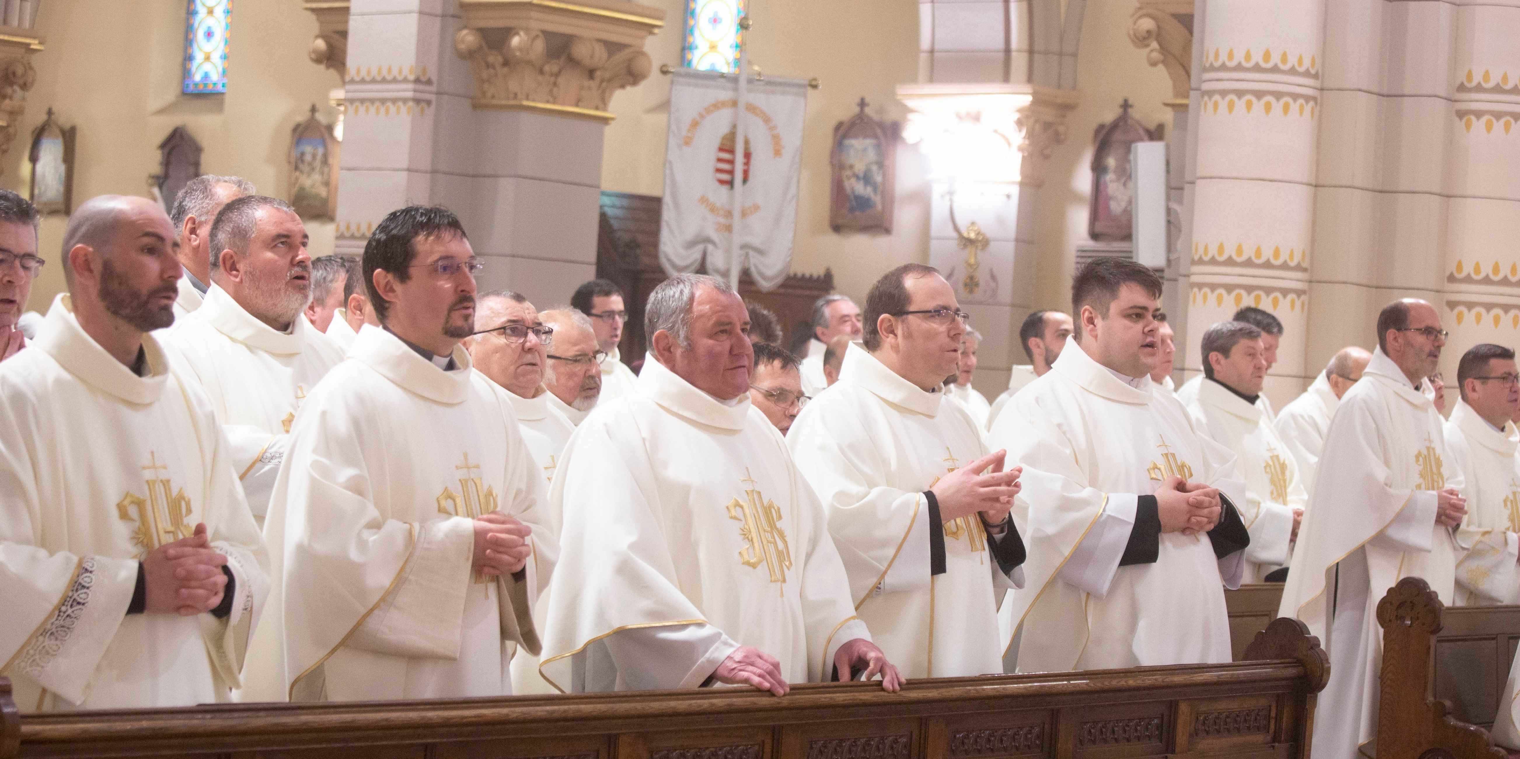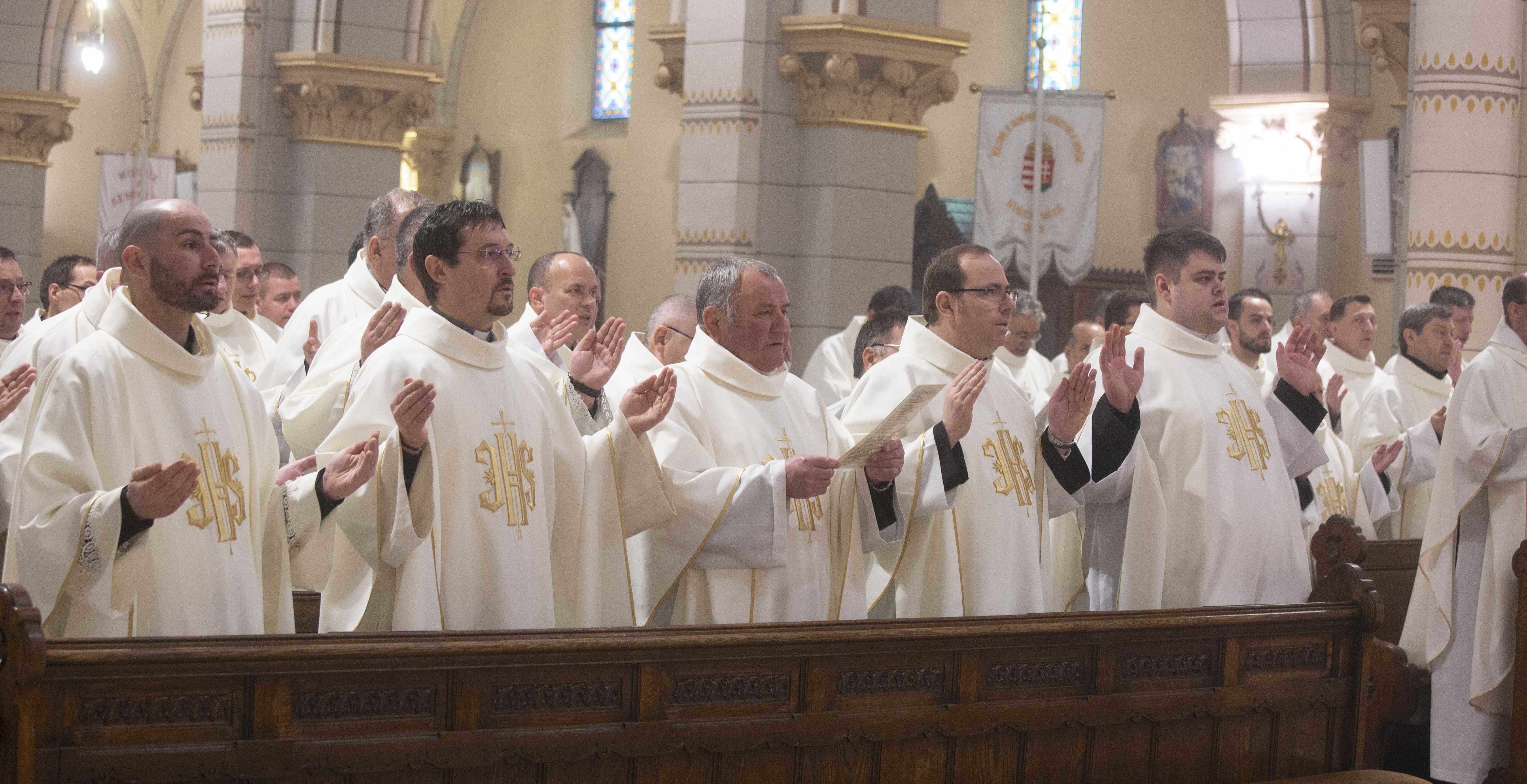 Szemléljük Őt, hogy milyen törékeny az Isten, Aki mégis szeret bennünket, minden emberi gyöngeségünkkel és gyarlóságainkkal együtt, vagy annak ellenére, és kérjük, hogy képviseljük az Ő szeretetét, legyünk az Ő szolgái, utánzói. Az Efezusi levélben írja Szent Pál apostol: „Kövessétek Isten példáját”, vagyis legyetek Isten utánzói. Utánozzuk a törékeny Istent, kössük hozzá az életünket, és kérjük, hogy segítsen bennünket egy életen át hűségesen szolgálni és a szeretetben járni és élni” – fejezte be elmélkedését Palánki Ferenc megyéspüspök, majd kérte a paptestvéreit, hogy együtt újítsák meg papi ígéreteiket, fogadalmukat.