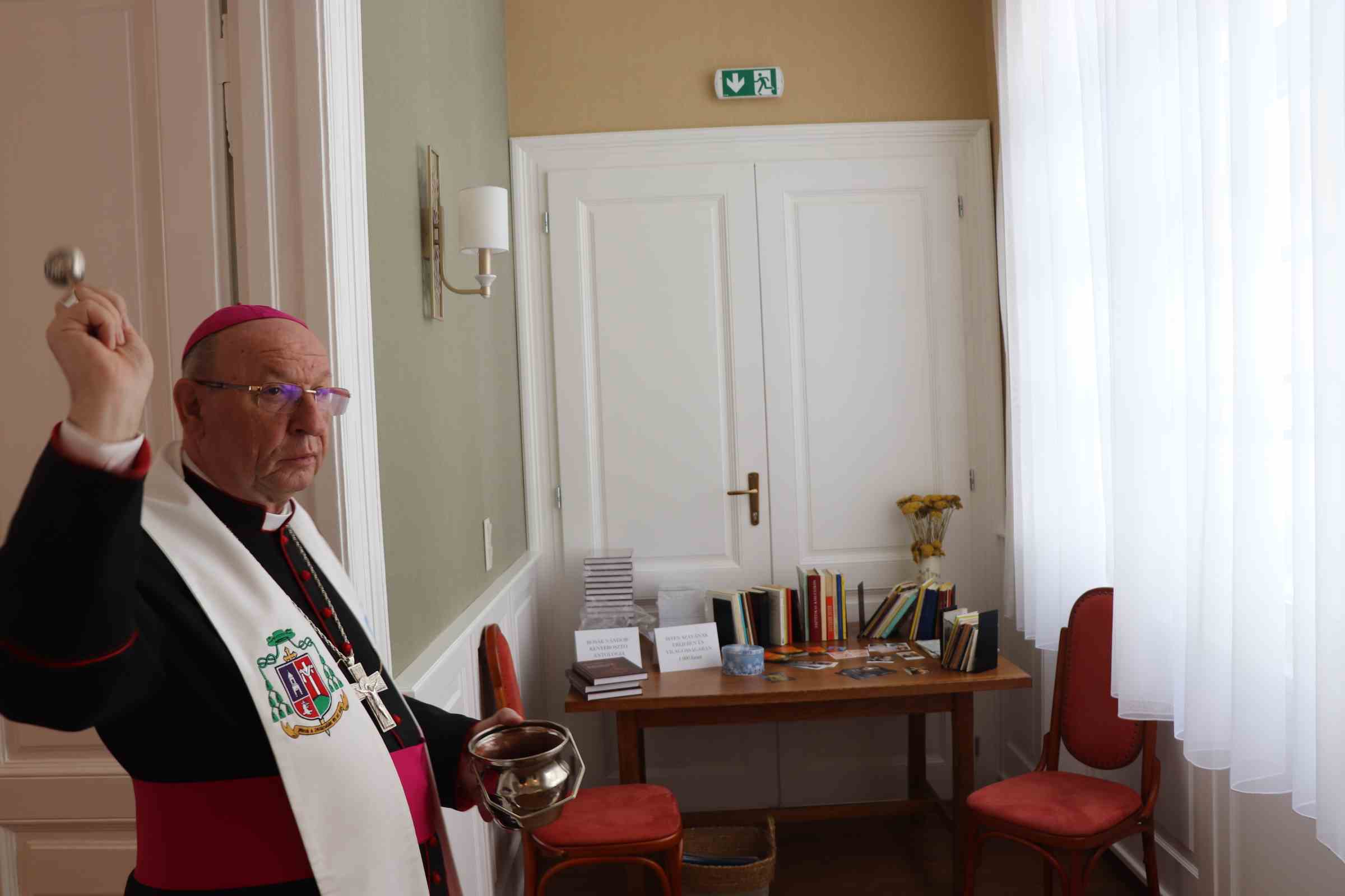Tóth László atya, egyházmegyénk hitoktatási referensének köszöntő szavai után főpásztorunk, Palánki Ferenc püspök úr áldotta meg a püspökséggel szemben lévő felújított cívisházban kialakított új létesítményt, amely szavai szerint otthona lesz a hitoktatóknak.