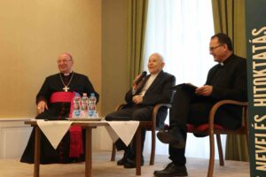 A továbbiakban rendhagyó módon nem előadást hallgathattunk meg, hanem jelenlegi főpásztorunkkal, Palánki Ferenc megyéspüspökkel és egyházmegyénk nyugalmazott püspökével, Bosák Nándor püspökkel folytatott kerekasztal-beszélgetés tanúi lehettünk, amelyet Tóth László atya moderált.