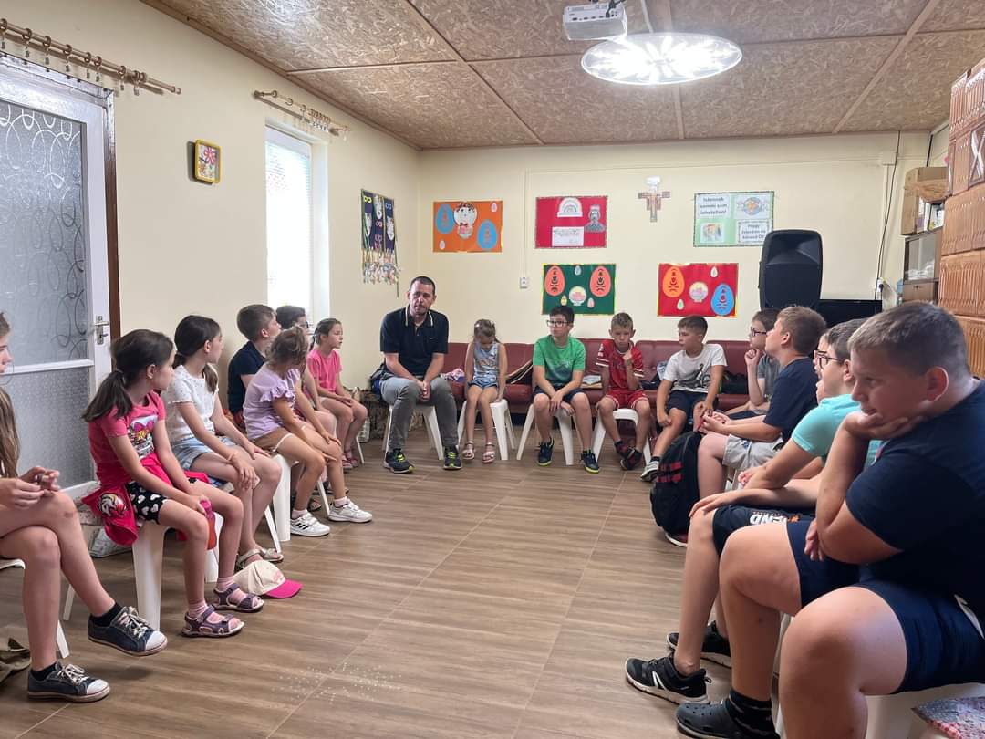 Hétfőn, a tábor első napján, mosolygós, Krisztust ajándékozni akaró és tudó atyák tartották a szentmisét, hiszen Németh István atya, az Isten irántunk megmutatkozó önzetlen szeretetéről beszélt nagyon közvetlenül gyermekeinknek, Lázár István atya pedig gitáros kísérettel, ifjúsági énekeket énekelve és tanítva tette felejthetetlenné a napot. Lajmán Gréta és Feketéné Nagy Magdolna pedagógusok, katekéták a nap folyamán játékok segítségével, mélyítették el bennünk Isten szeretetét, hogy azt mi is merjük megélni a mai világban.