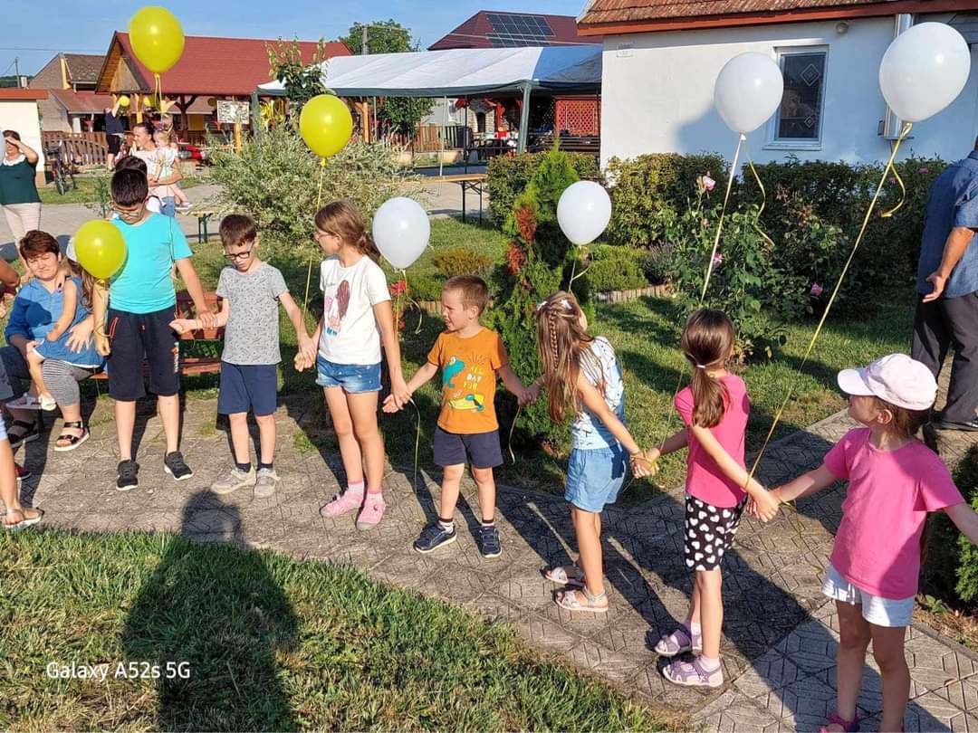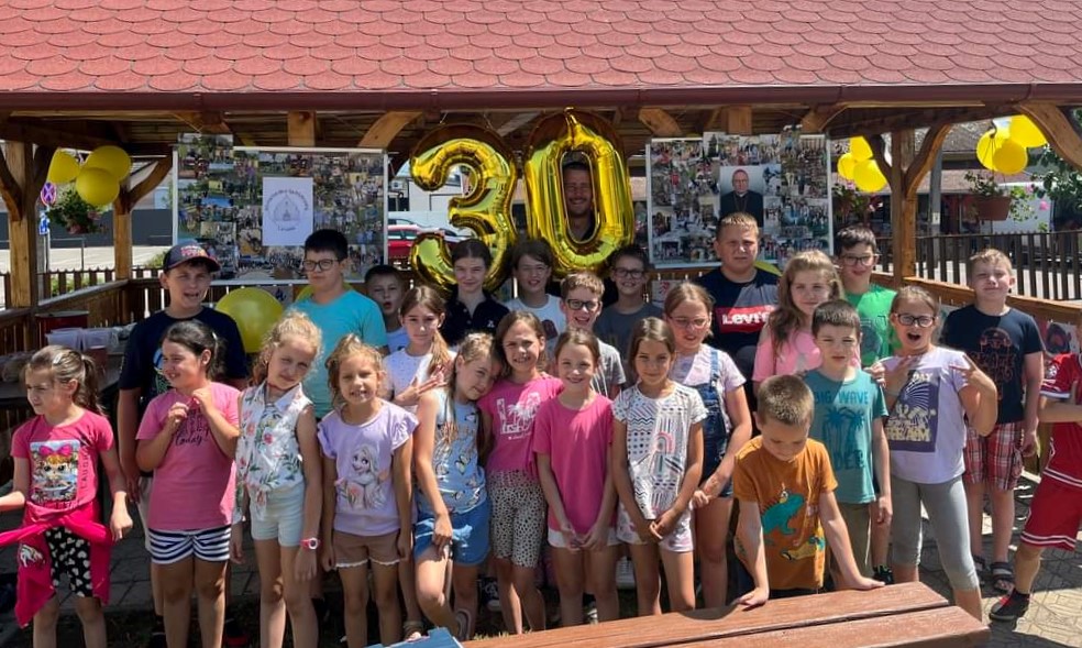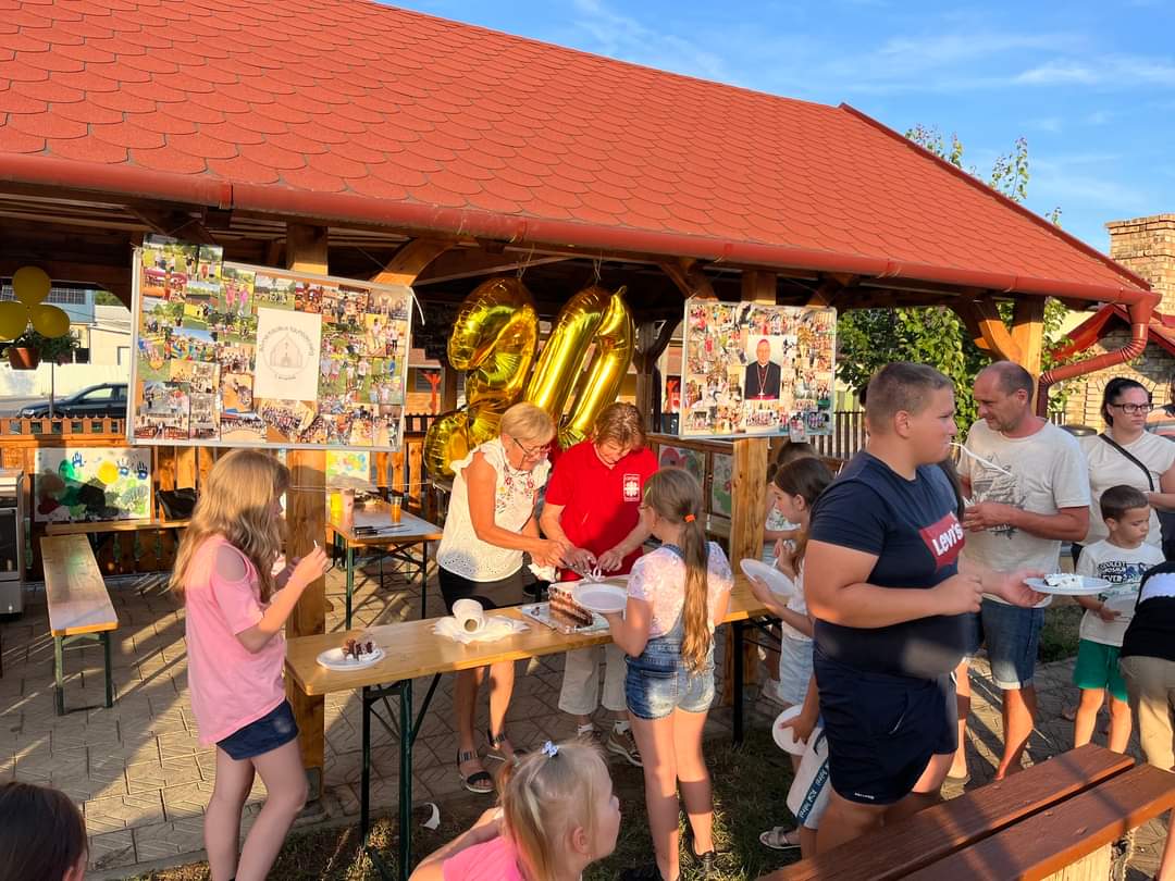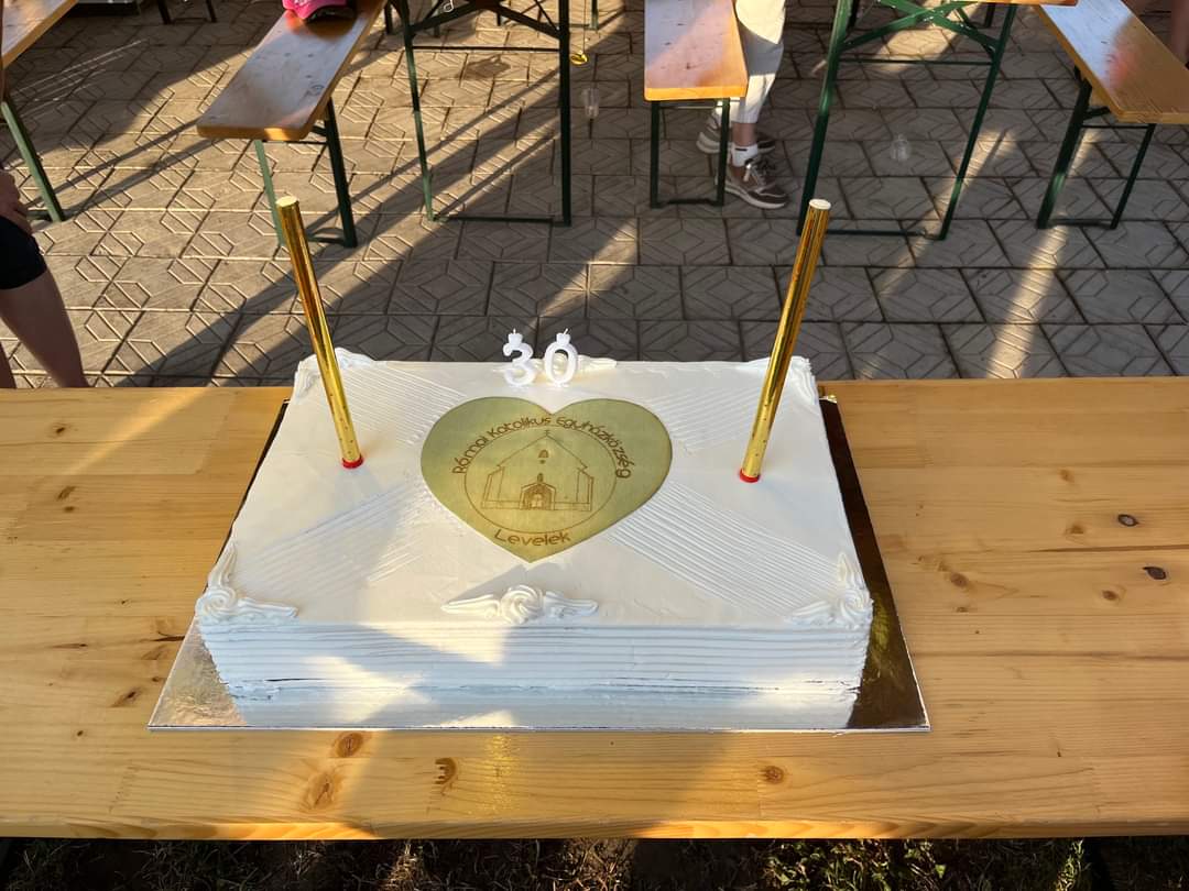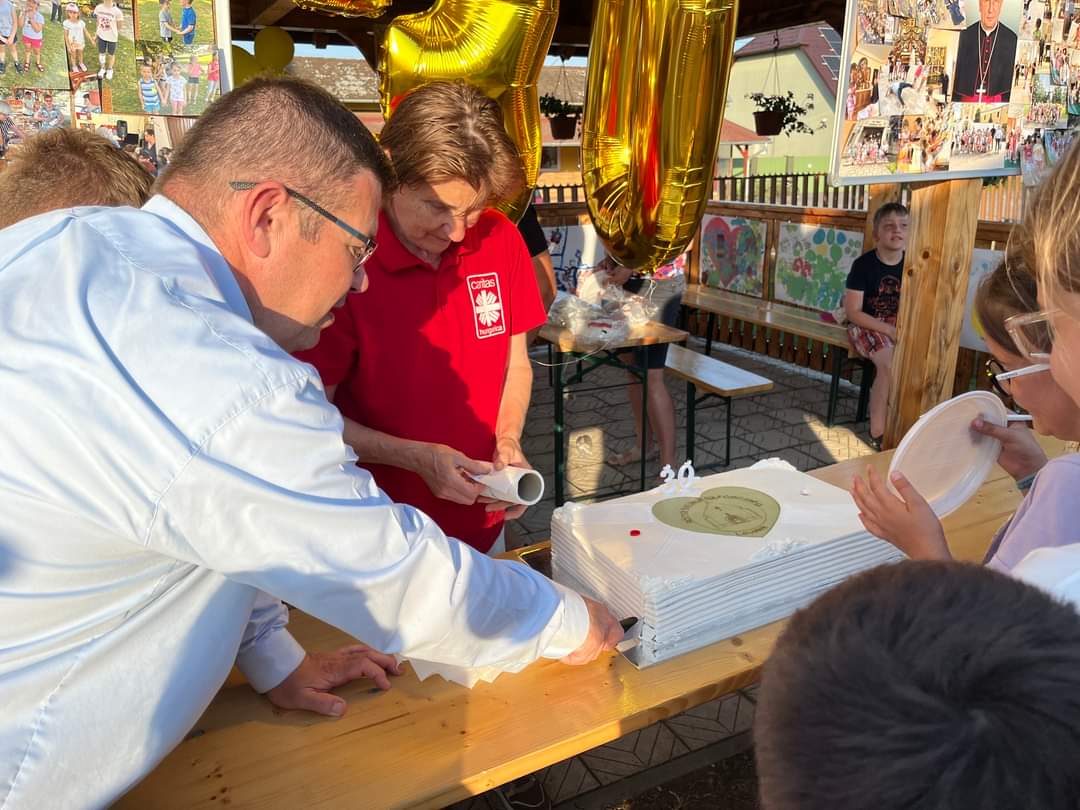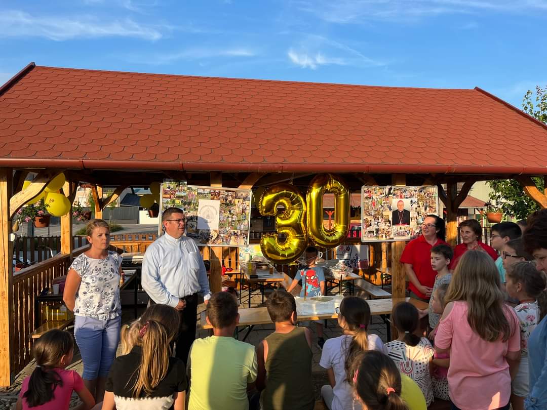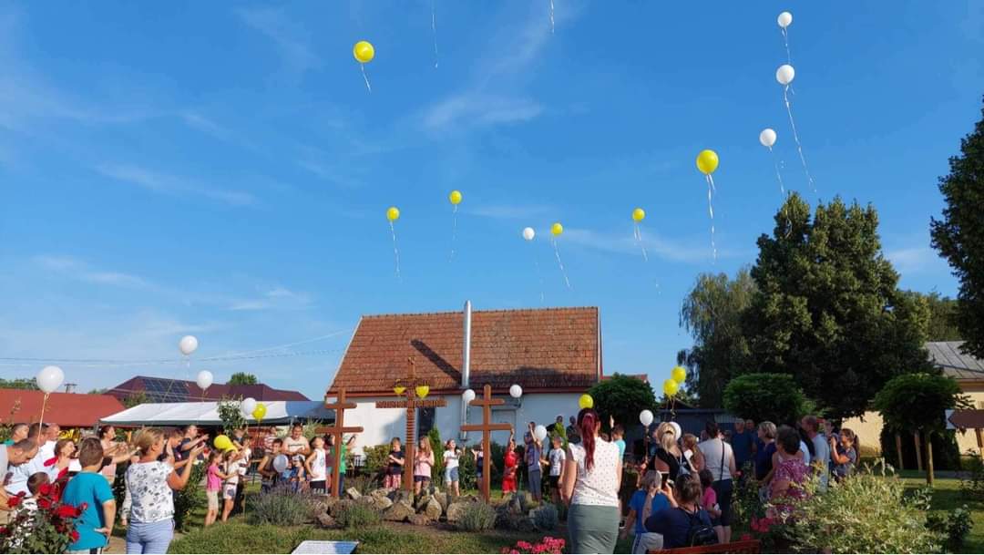Ezután elcsöndesedtünk, mert a táborozó gyerekek imádságokat írtak le egy lapra, amelyeket sárga és fehér (az Egyház színei) héliumos lufikba (30 darab) helyeztek és a plébánia kertjében lévő Golgota körül állva az ég felé felengedtek szüleik és a jelenlévők imádságaival kísérve. Elfogyasztottuk a vacsorát (babgulyás), amelynek felajánlását köszönjük Nagy István apukának, a főzést pedig neki és segítőinek. Mivel 30 éves az egyházmegyénk, ezért nem maradhatott el a születésnapi torta sem, amelyet Puskás Olivér apuka ajánlott fel családjával együtt. A nap végén tényleg elmondhattuk, amit a tábor első napján megfogalmaztunk: „Jó nekünk itt együtt lennünk!”