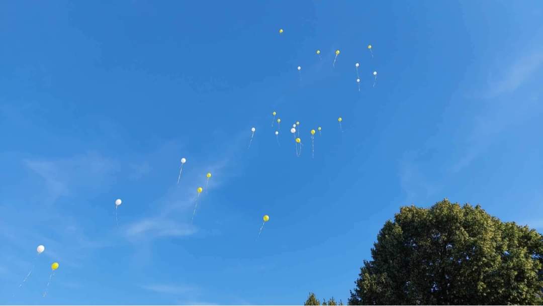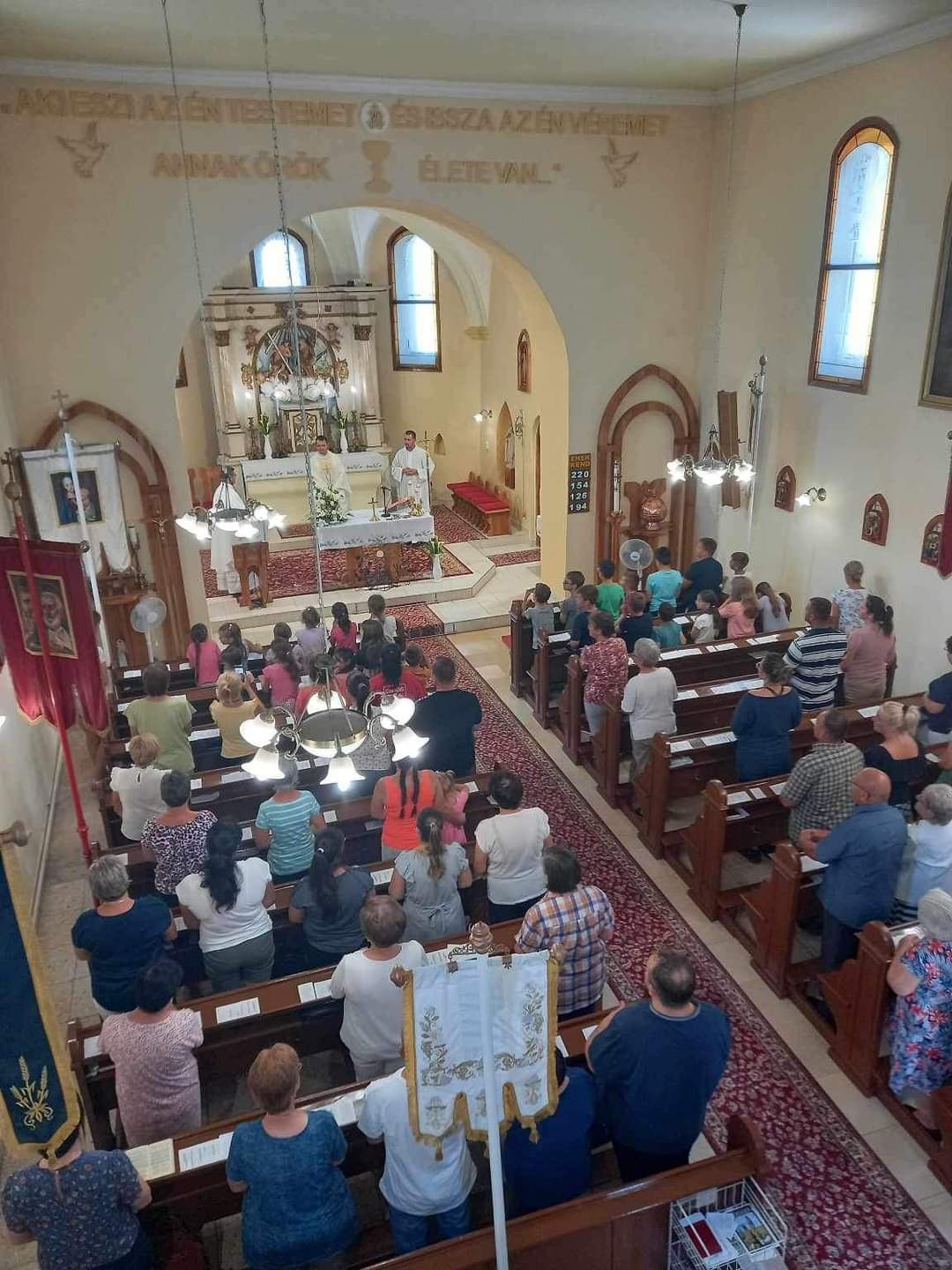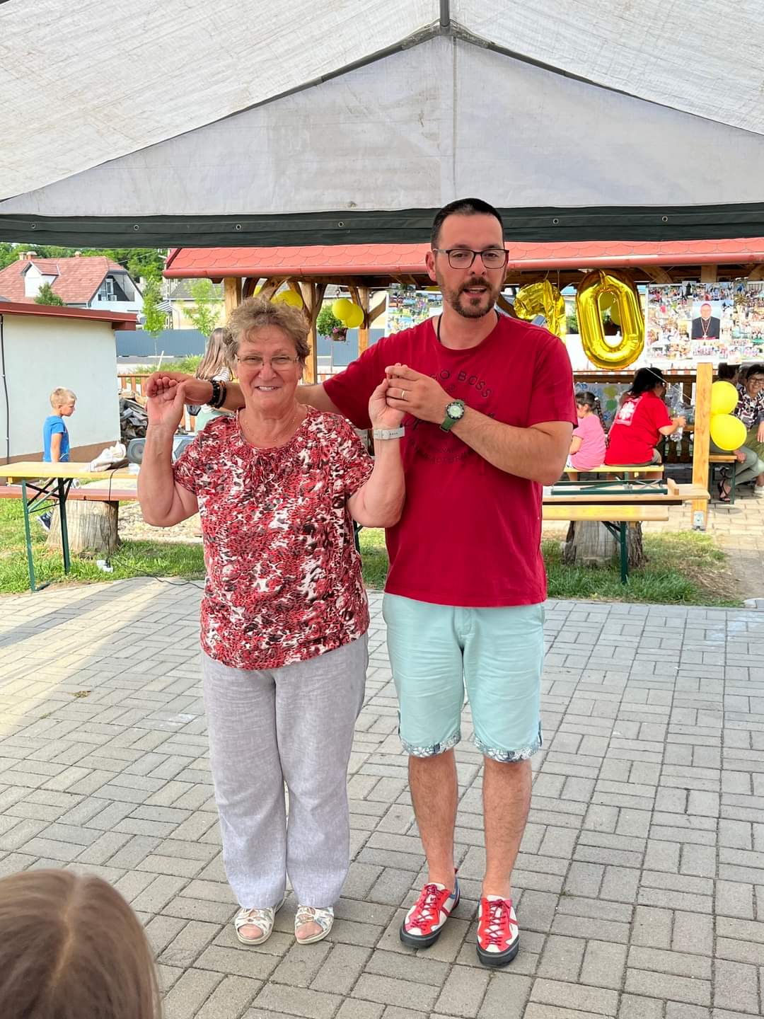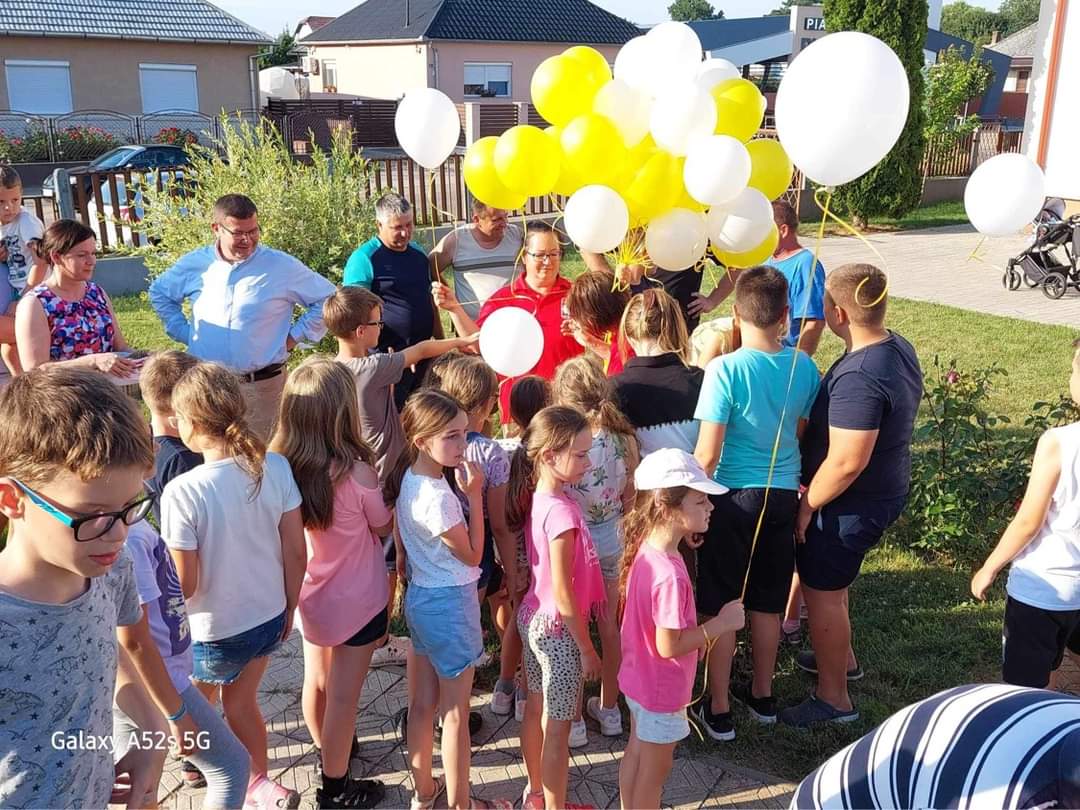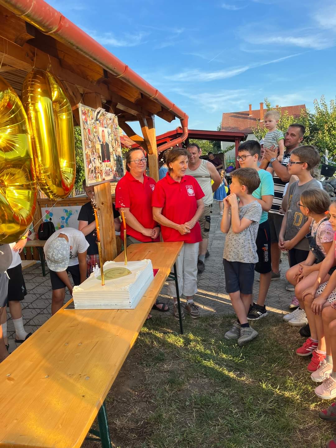 Ezután elcsöndesedtünk, mert a táborozó gyerekek imádságokat írtak le egy lapra, amelyeket sárga és fehér (az Egyház színei) héliumos lufikba (30 darab) helyeztek és a plébánia kertjében lévő Golgota körül állva az ég felé felengedtek szüleik és a jelenlévők imádságaival kísérve. Elfogyasztottuk a vacsorát (babgulyás), amelynek felajánlását köszönjük Nagy István apukának, a főzést pedig neki és segítőinek. Mivel 30 éves az egyházmegyénk, ezért nem maradhatott el a születésnapi torta sem, amelyet Puskás Olivér apuka ajánlott fel családjával együtt. A nap végén tényleg elmondhattuk, amit a tábor első napján megfogalmaztunk: „Jó nekünk itt együtt lennünk!”