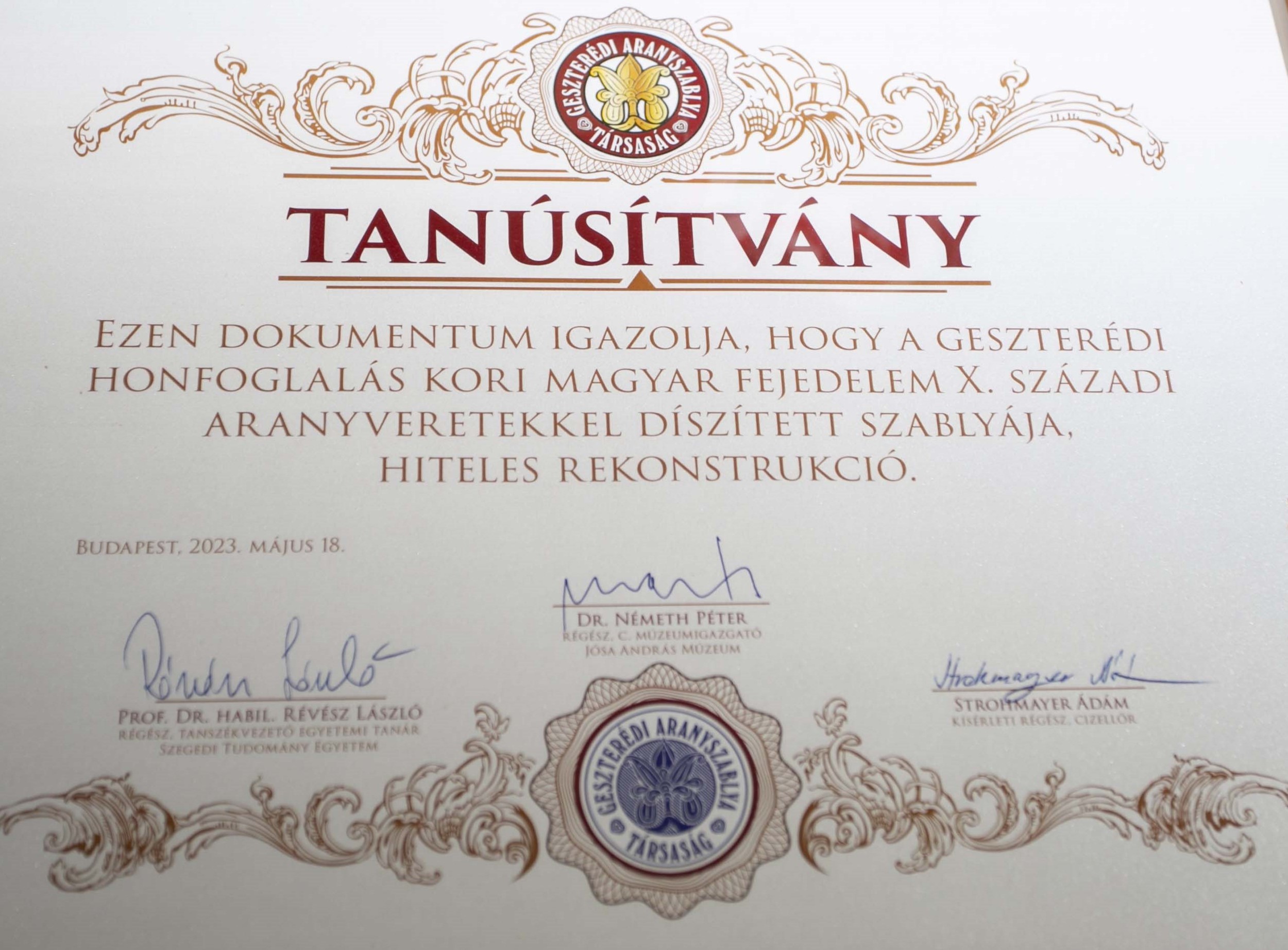 Beszélt arról, hogy a rekonstrukció megalkotása a Magyar Nemzeti Múzeumot is arra inspirálja, hogy követve ezt a példát, rekonstruálják a régészeti leleteket, ezáltal is ismertté, befogadhatóbbá téve azokat a látogatók számára. Seszták Oszkár gratulált az Aranyszablya Társaságnak, és kérte, hogy tegyék élményszerűvé ezt a történetet minden Geszteréden felnövekvő generációnak, mélyítve ez irányú ismereteiket, továbbadva a tárgyi örökséggel együtt járó geszterédi identitást, az önazonosságot szolgáló összefogást.