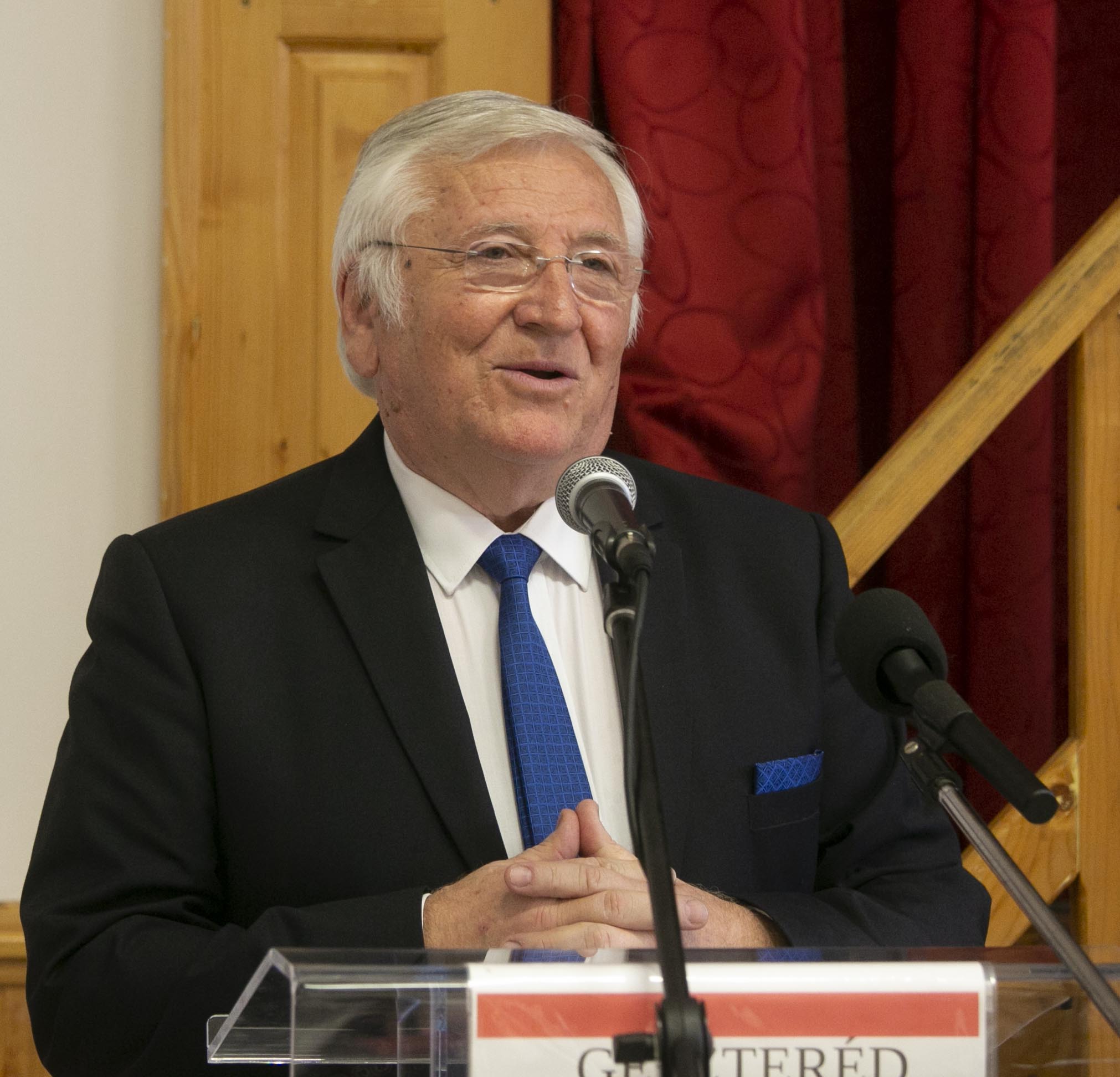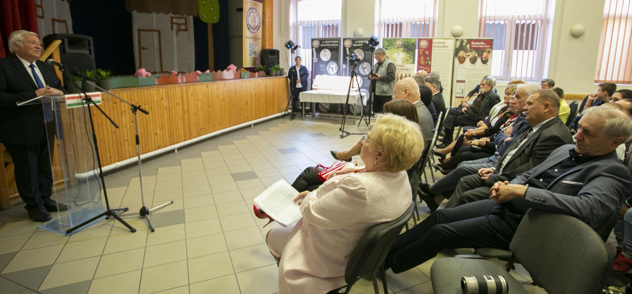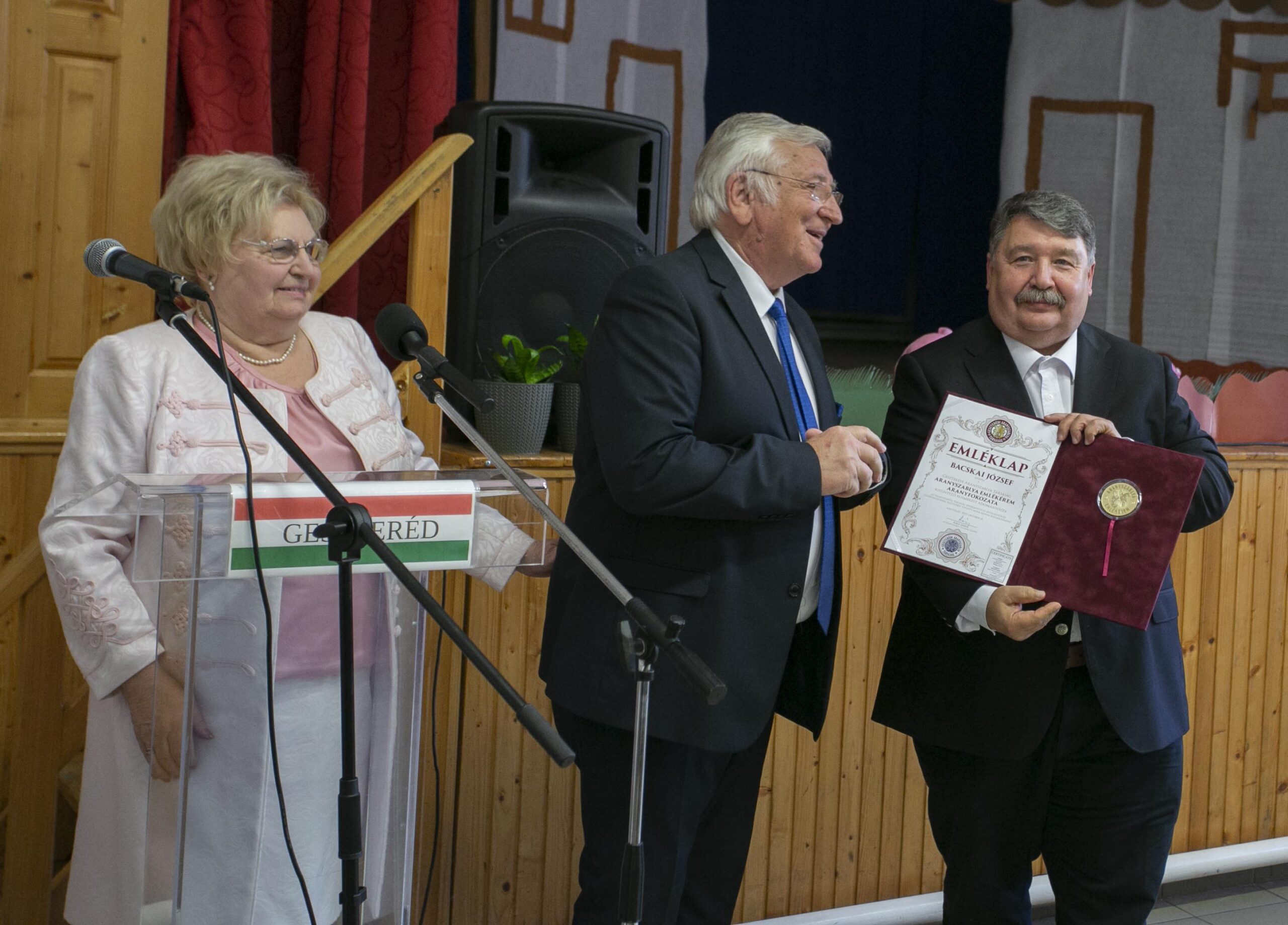 Szabó József, Geszteréd polgármestere visszaemlékezett a diákéveire, Varga Gyula tanárára, aki sokat beszélt nekik az aranyszablyáról, majd a 2015-ben a Rácz János és családja által megalapított Geszterédi Aranyszablya Társaságra tekintett, amely többek között azzal a céllal jött létre, hogy megalkossák az aranyszablya hiteles rekonstrukcióját. A polgármester köszönetet mondott a társaság alapítóinak a kezdeményezésért, az eddigi tevékenységeikért, és háláját fejezte ki mindazoknak, akik munkájukkal és anyagi támogatásukkal segítették a rekonstrukció elkészítését.