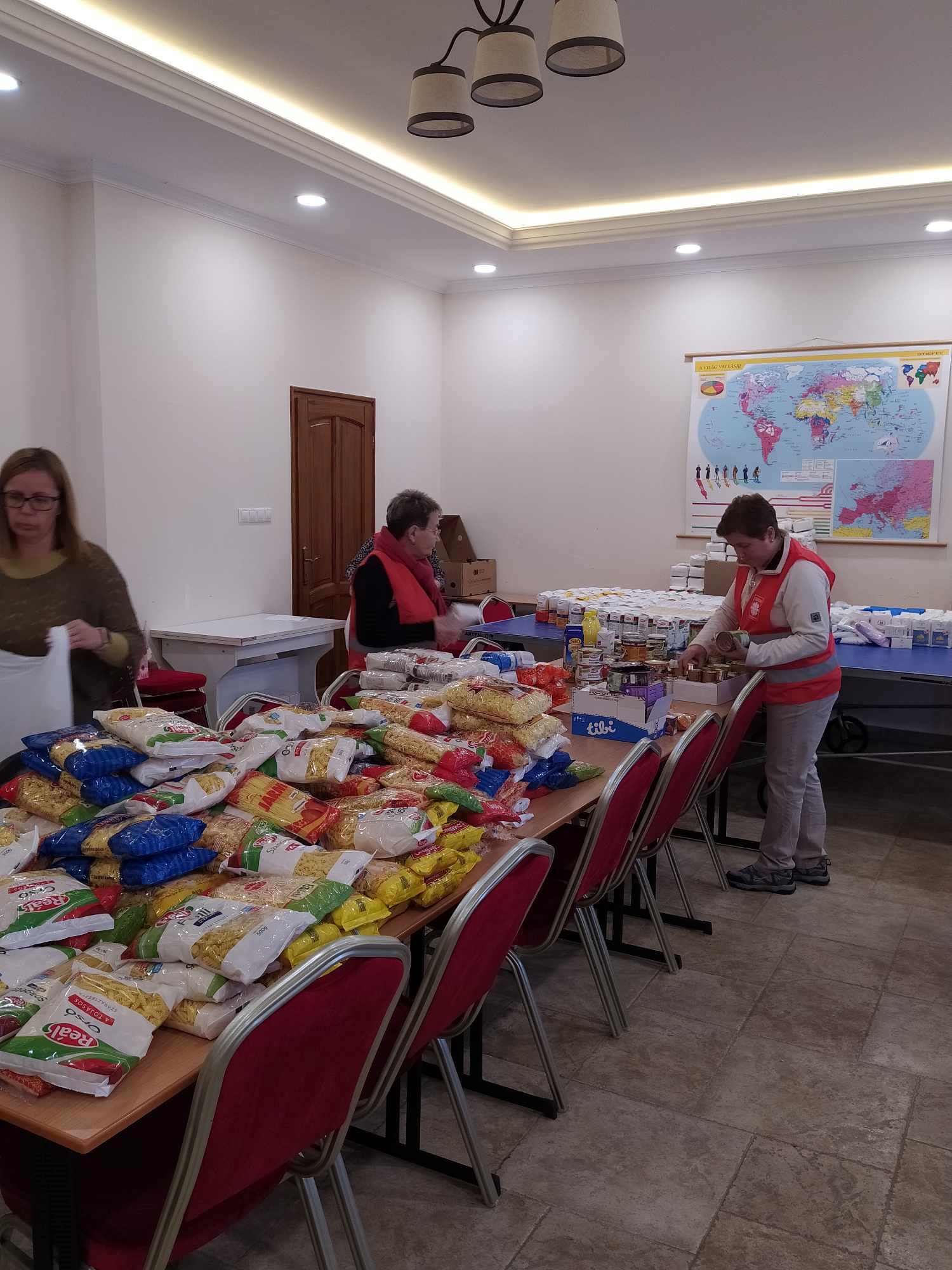 A gyűjtés következő hetében szorgos kezek válogatták külön az egyházközség közösségi házában a megérkezett élelmiszereket, s gyors számolás után közel 10 kg-os élelmiszercsomagot tudtunk összeállítani 65 család részére.