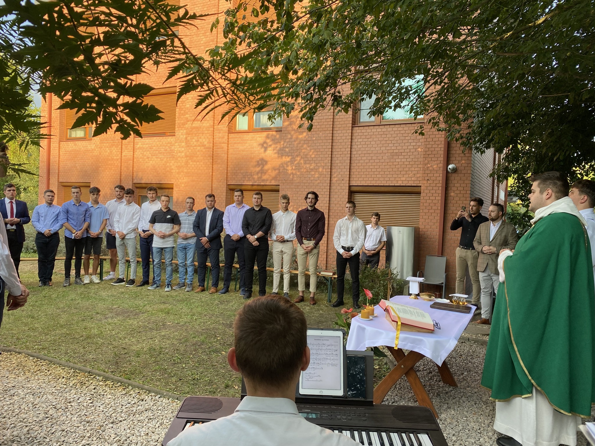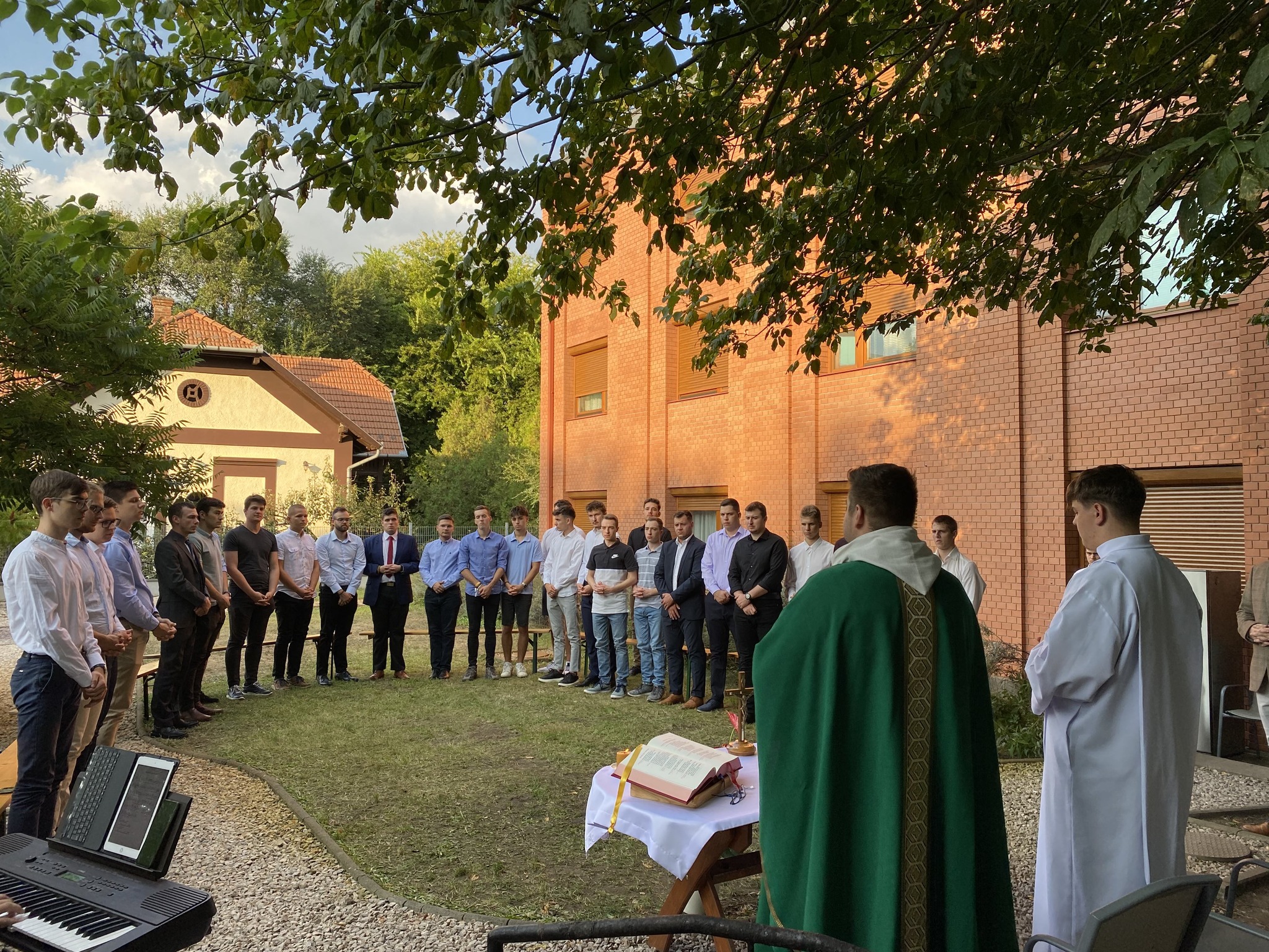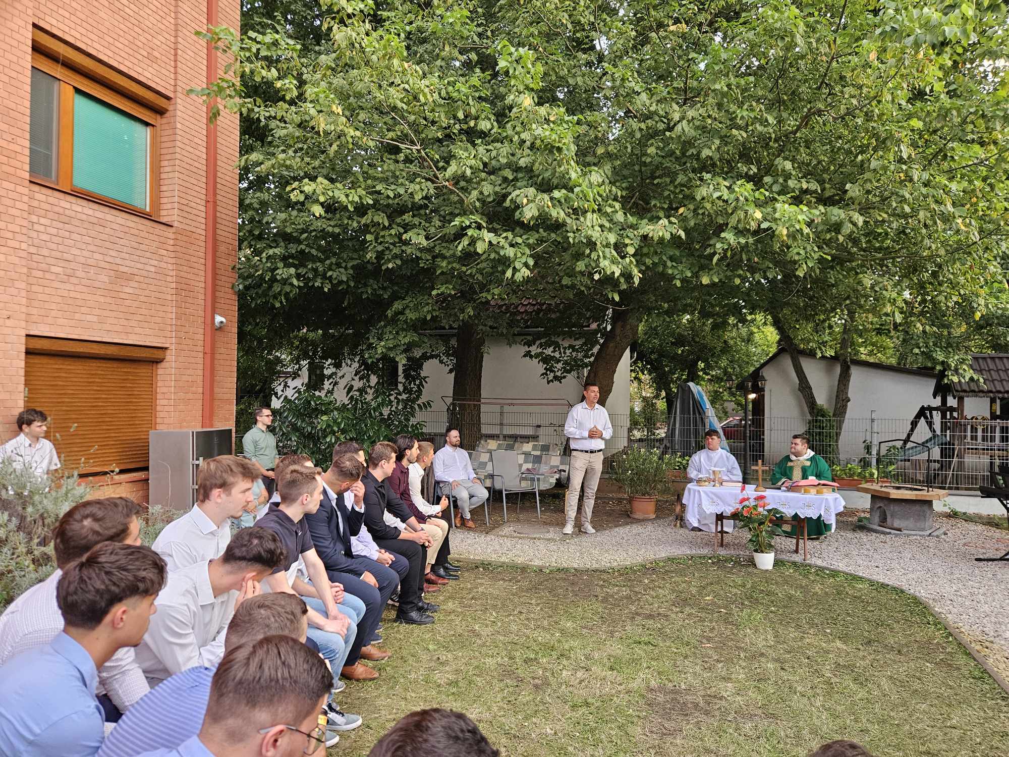 Ezen a hétvégén a kollégisták a Szentlélek segítségét is kérték az elkövetkezendő szorgalmi időszakra, az életükre. A Veni Sancte szentmisét Németh István püspöki titkár mutatta be, amelyet rendhagyó módon a hátsó kertben tartottak.