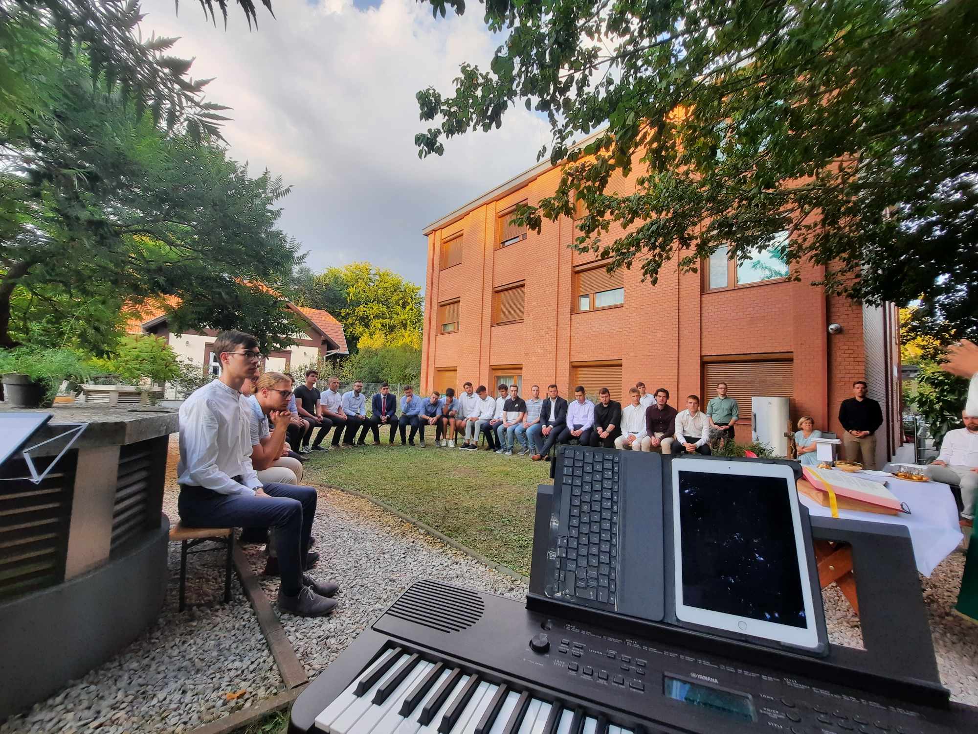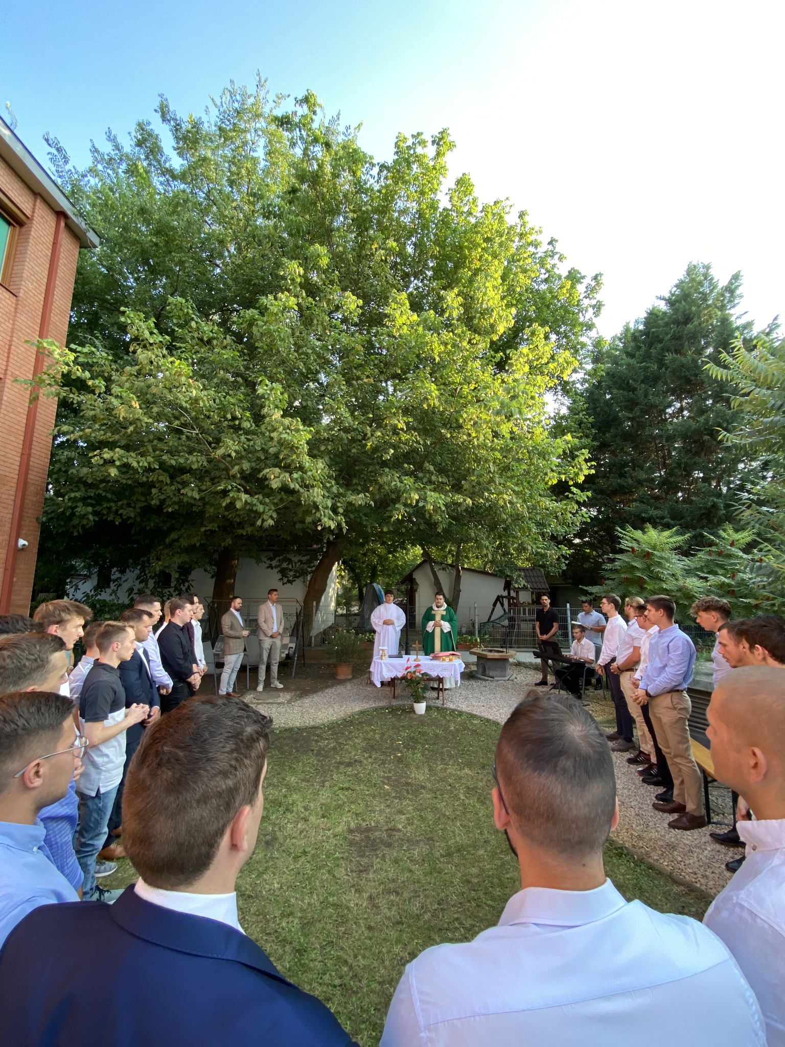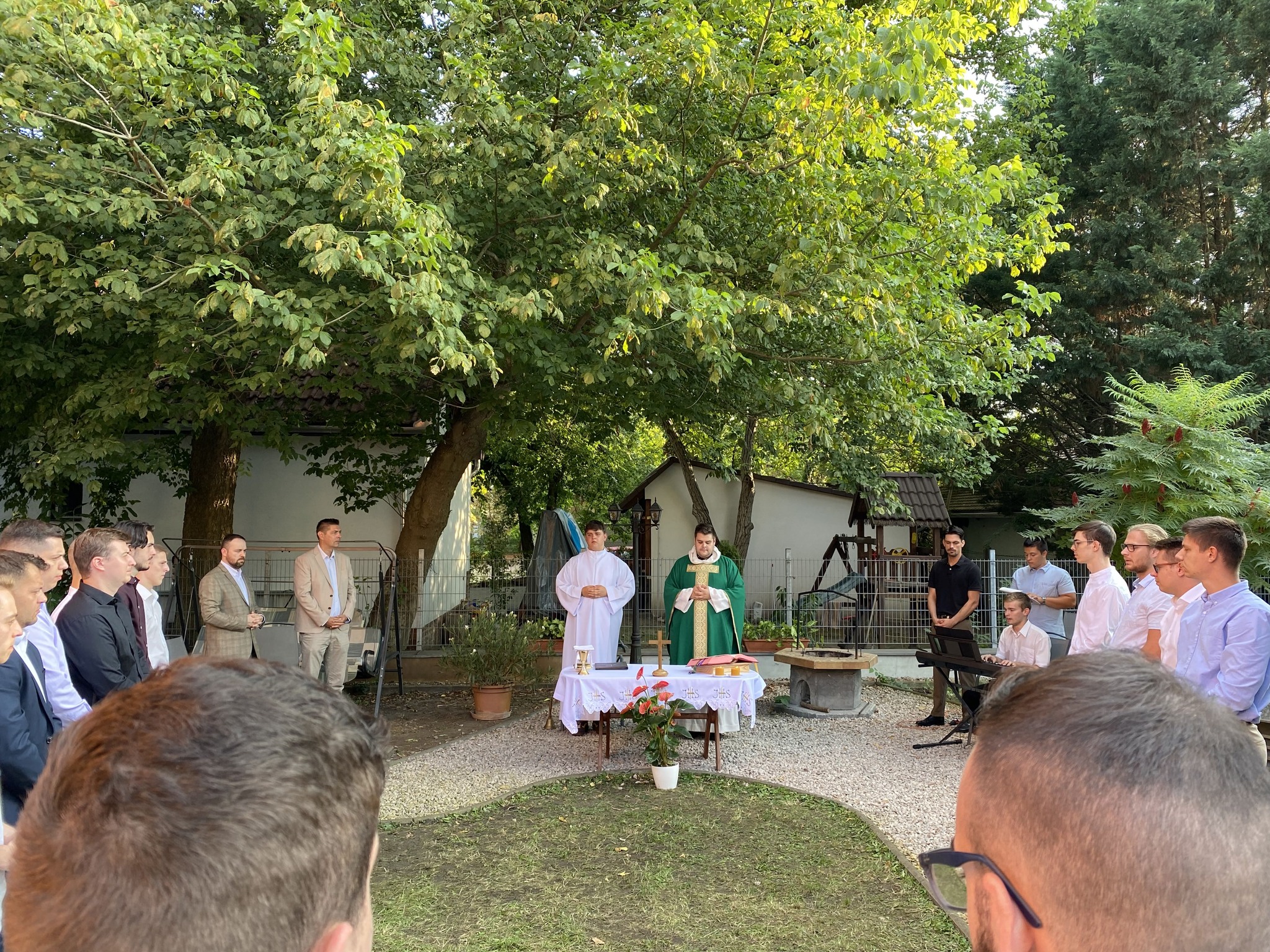 Ezen a hétvégén a kollégisták a Szentlélek segítségét is kérték az elkövetkezendő szorgalmi időszakra, az életükre. A Veni Sancte szentmisét Németh István püspöki titkár mutatta be, amelyet rendhagyó módon a hátsó kertben tartottak.