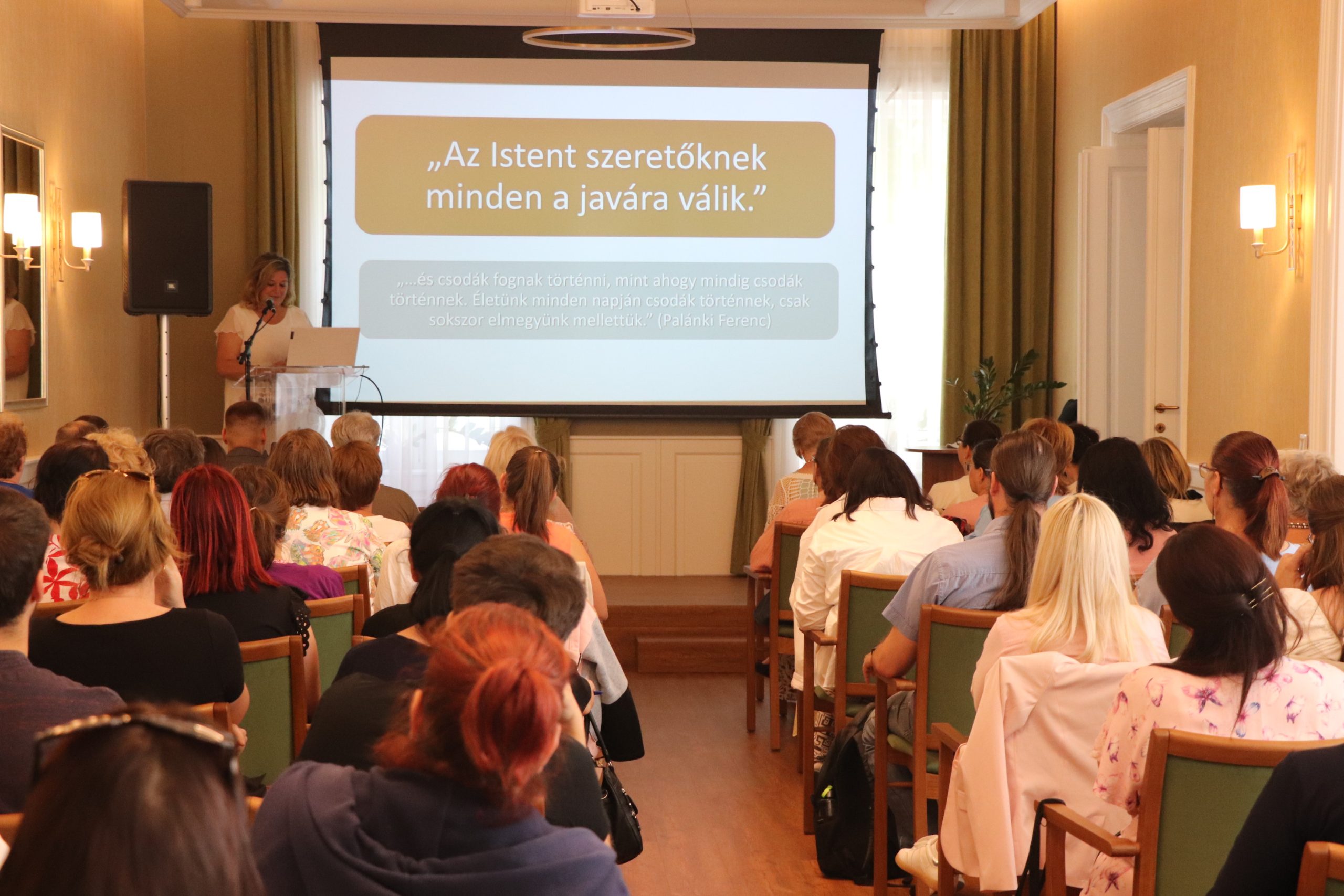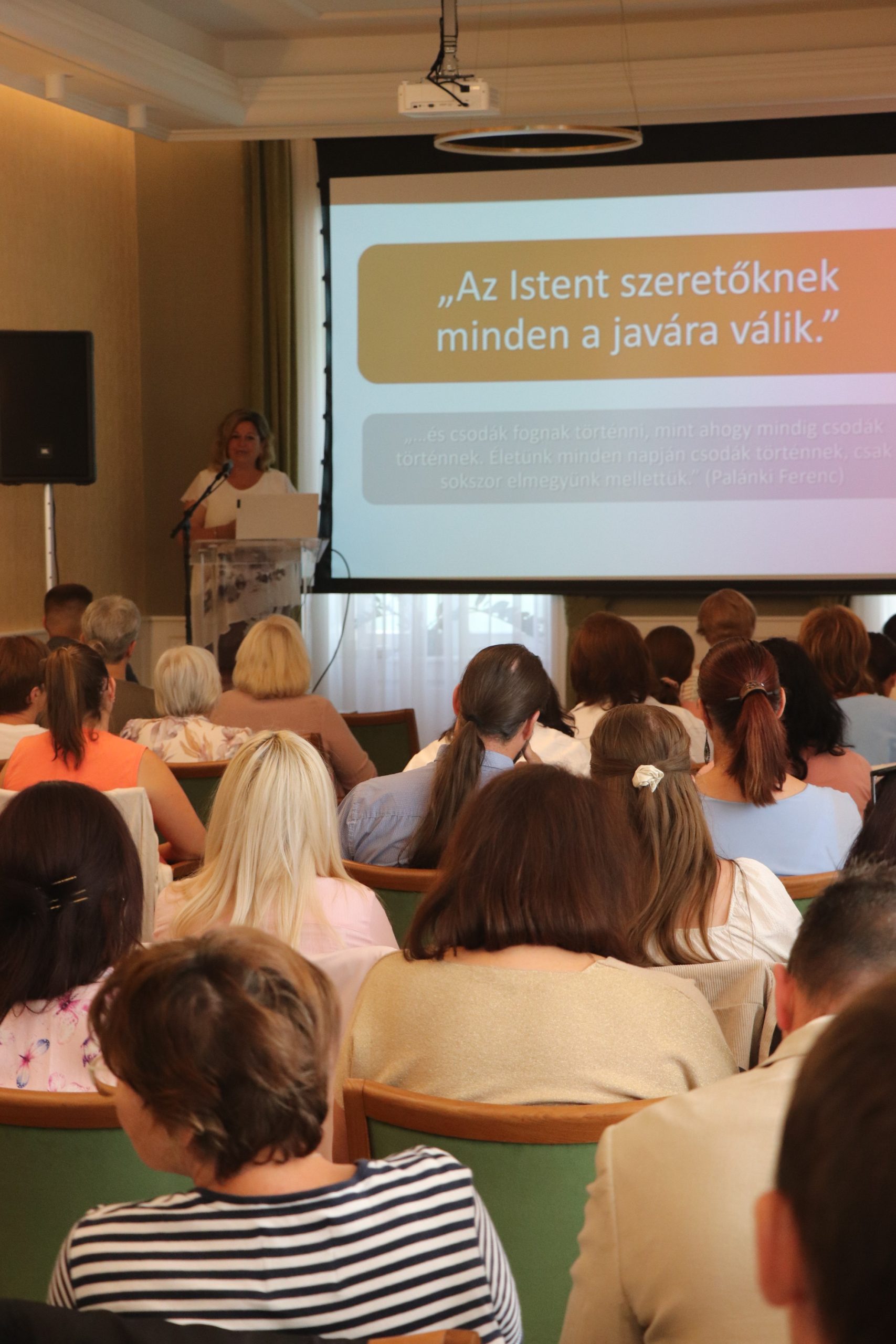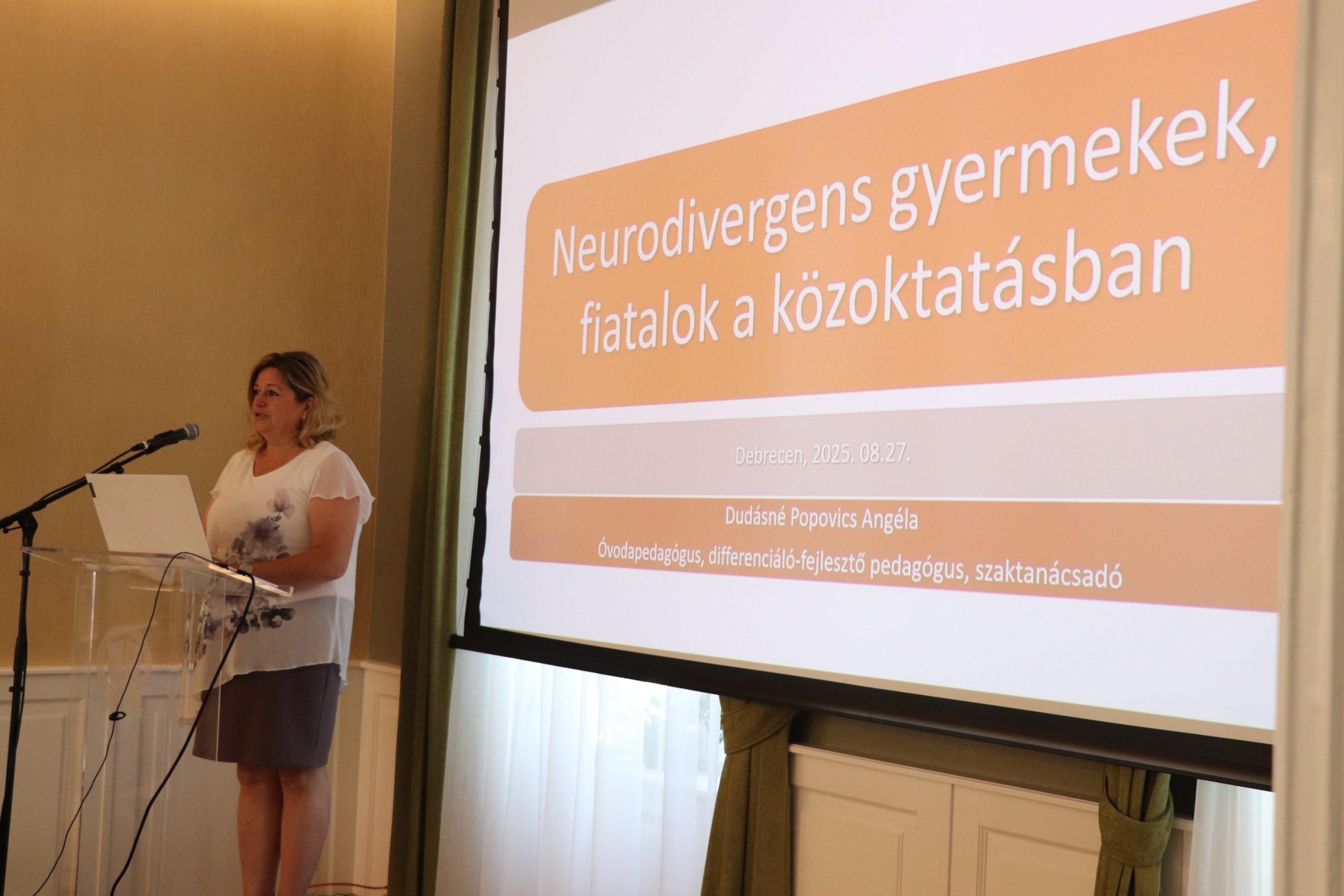 A továbbiakban Dudásné Popovics Angéla, óvodapedagógus, differenciáló-fejlesztő pedagógus, szaktanácsadó, a kisvárdai Szent László Katolikus Gimnázium, Technikum, Két Tanítási Nyelvű Általános Iskola, Kollégium, Óvoda és Bölcsőde óvodavezetője A neurodivergens gyermekek, fiatalok a közoktatásban címmel tartott fontos információkat nyújtó, hallgatóságát érzelmileg is megérintő előadást. A téma, az átlagostól eltérő idegrendszerű gyermekkekkel való foglalkozás – köztük az úgynevezett szenzoros gyermekekkel, akiknek az idegrendszere bizonyos ingereket nem képes feldolgozni, és akik óvodáinkban akár 16 %-ban is jelen vannak – jól illeszkedik keresztény küldetésünkhöz, a periférián lévők, nehézségekkel küzdők szeretetteljes és hozzáértő segítésének ügyéhez.