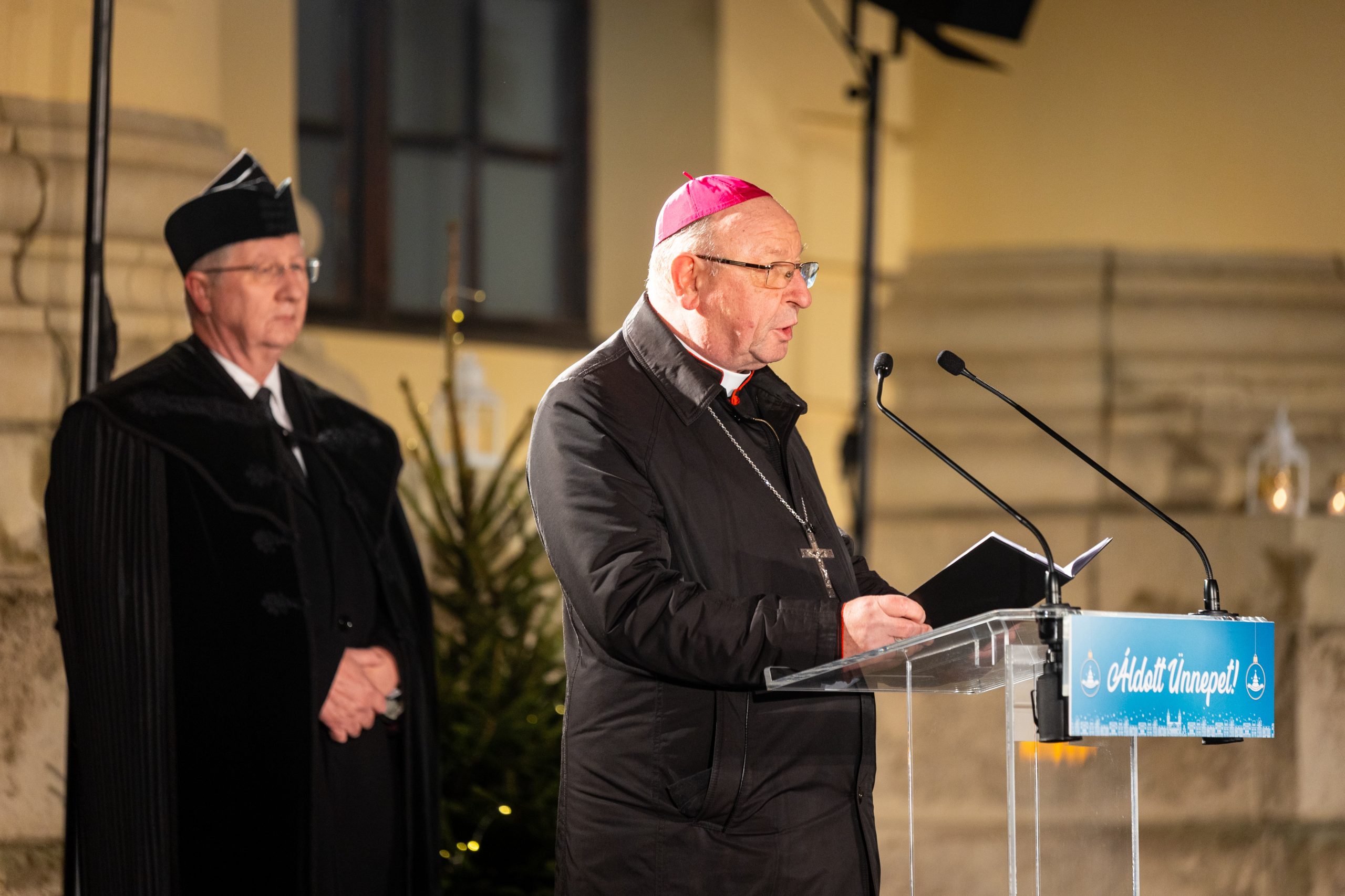 Papp László polgármester beszéde kezdetén XIV. Leó pápa gondolatait osztotta meg, miszerint: „Aki zarándoklaton vesz részt és célba érkezik, annak fontos felidéznie a döntés pillanatát.” A városvezető felidézte, hogy az előző héten elvitték Rómába Debrecen szeretetét és üdvözletét, egy csodálatos faragott és egy mézeskalácsból készült betlehem formájában. Egy darabka Debrecen, a magyar karácsonyi tradíciók csodaszép darabja, mostantól évről-évre kézzelfogható kapocs lesz az európai kereszténység két kiemelkedő központja, Róma és Debrecen között – hangsúlyozta.