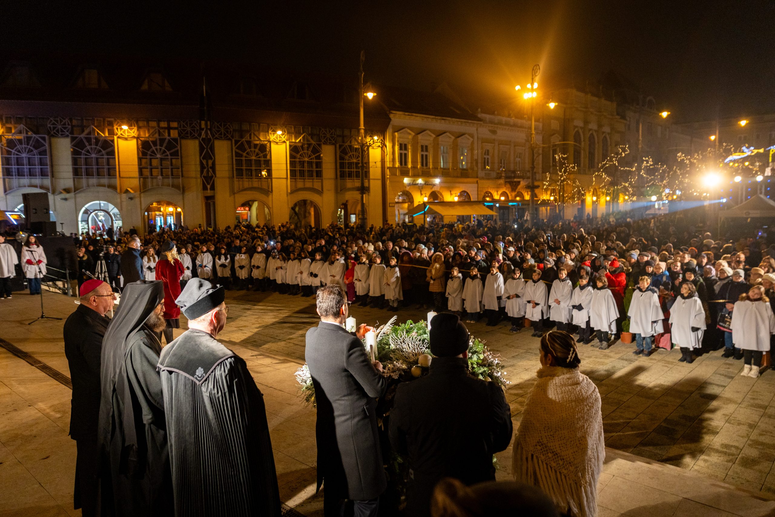 Az első adventi gyertya meggyújtását a hagyományokhoz hűen a római katolikus, a görögkatolikus, és a református egyház képviselőivel közösen gyújtotta meg Debrecen polgármestere. Az ünnepi alkalmon Palánki Ferenc, a Debrecen-Nyíregyházi Egyházmegye megyéspüspöke, Kocsis Fülöp, a Hajdúdorogi Főegyházmegye érsek-metropolitája és Fekete Károly, a Tiszántúli Református Egyházkerület püspöke is megosztotta adventi üzenetét a jelenlévőkkel.