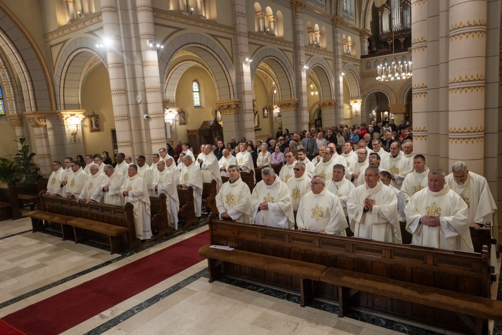 Palánki Ferenc megyéspüspök rámutatott: nagycsütörtök a „rácsodálkozás napja” – rácsodálkozás a lét ajándékára, a meghívottságra és a papság kegyelmére. Isten nem önmagunkért hívott életre bennünket, hanem azért, hogy másokért éljünk, és az ő szeretetével szeressünk. Ezt a gondolatot tovább mélyítve hangsúlyozta: létünk alapja nem csupán az, hogy gondolkodunk, hanem hogy Isten gondolt és szeretett bennünket. „Szeretve vagyunk – ezért vagyunk” – fogalmazott.